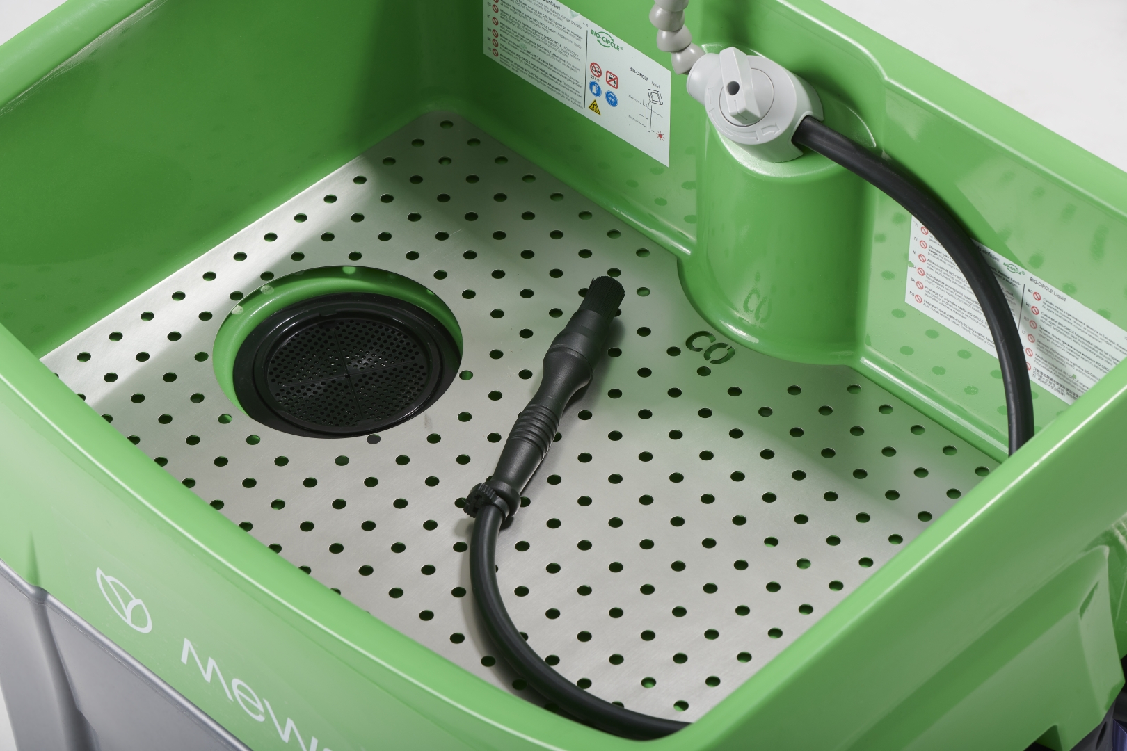 Společnost Mewa nabízí tuto technologii v podobě mycích stolů se štětcem ve dvou velikostech a také v provedení vysokotlakých čističů dílů. Ty jsou užitečné zejména v případech, kdy je třeba vyčistit mnoho silně znečištěných dílů nebo dílů s velmi šikmou geometrií. Zde je účinek čisticí kapaliny zesílen tlakem až 80 barů a teplota čištění se pohybuje kolem 40 stupňů.